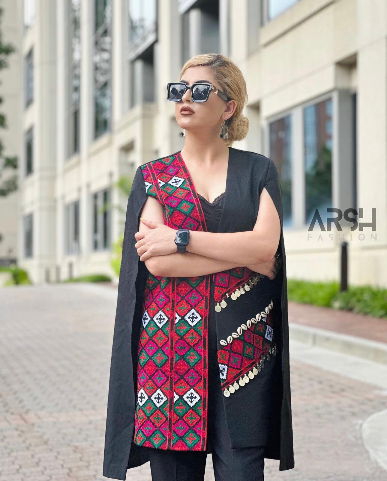A modern take on Afghan traditional embroidery. Made from high-quality fabric and adorned with intricate hand works and embroidery.