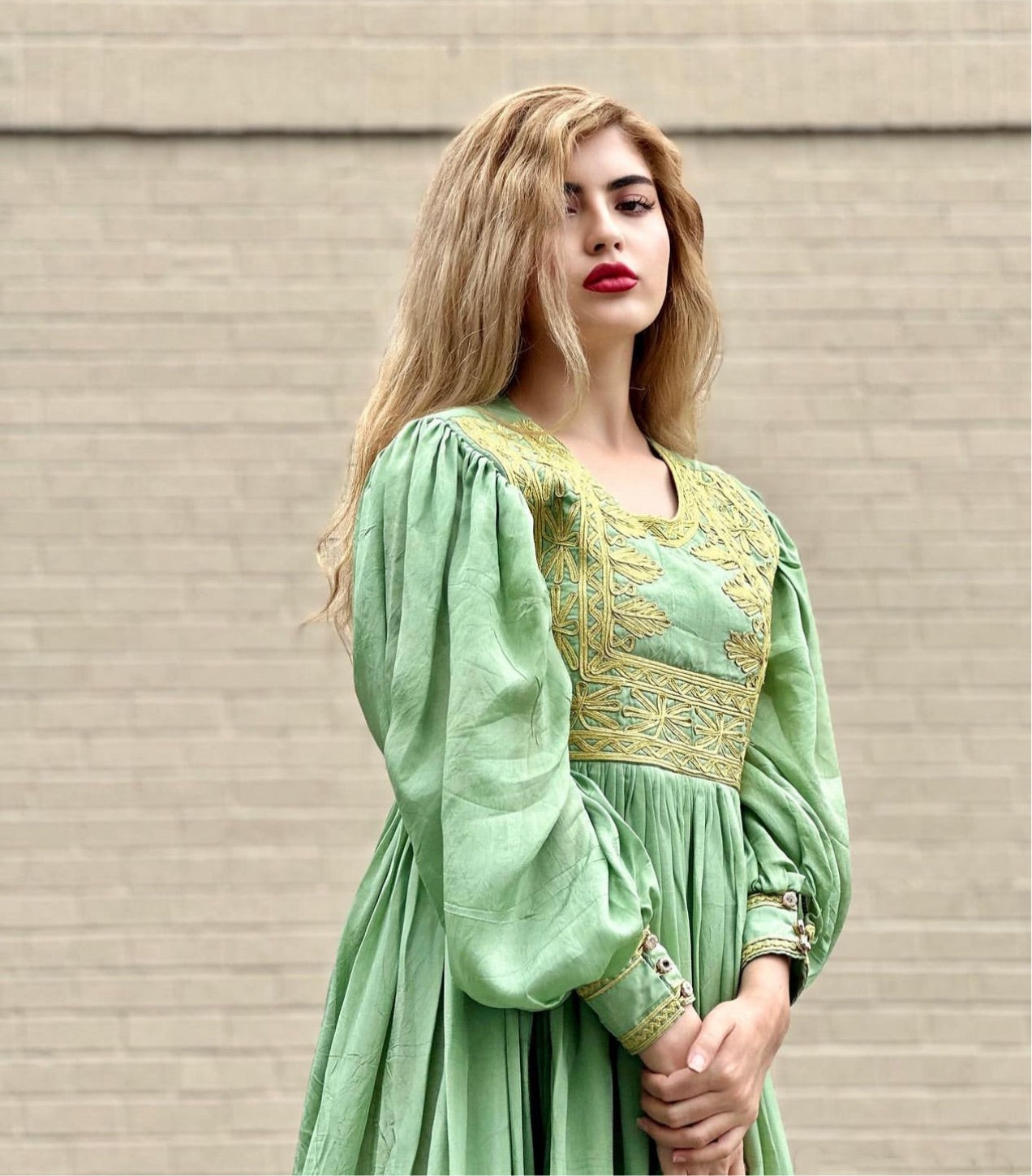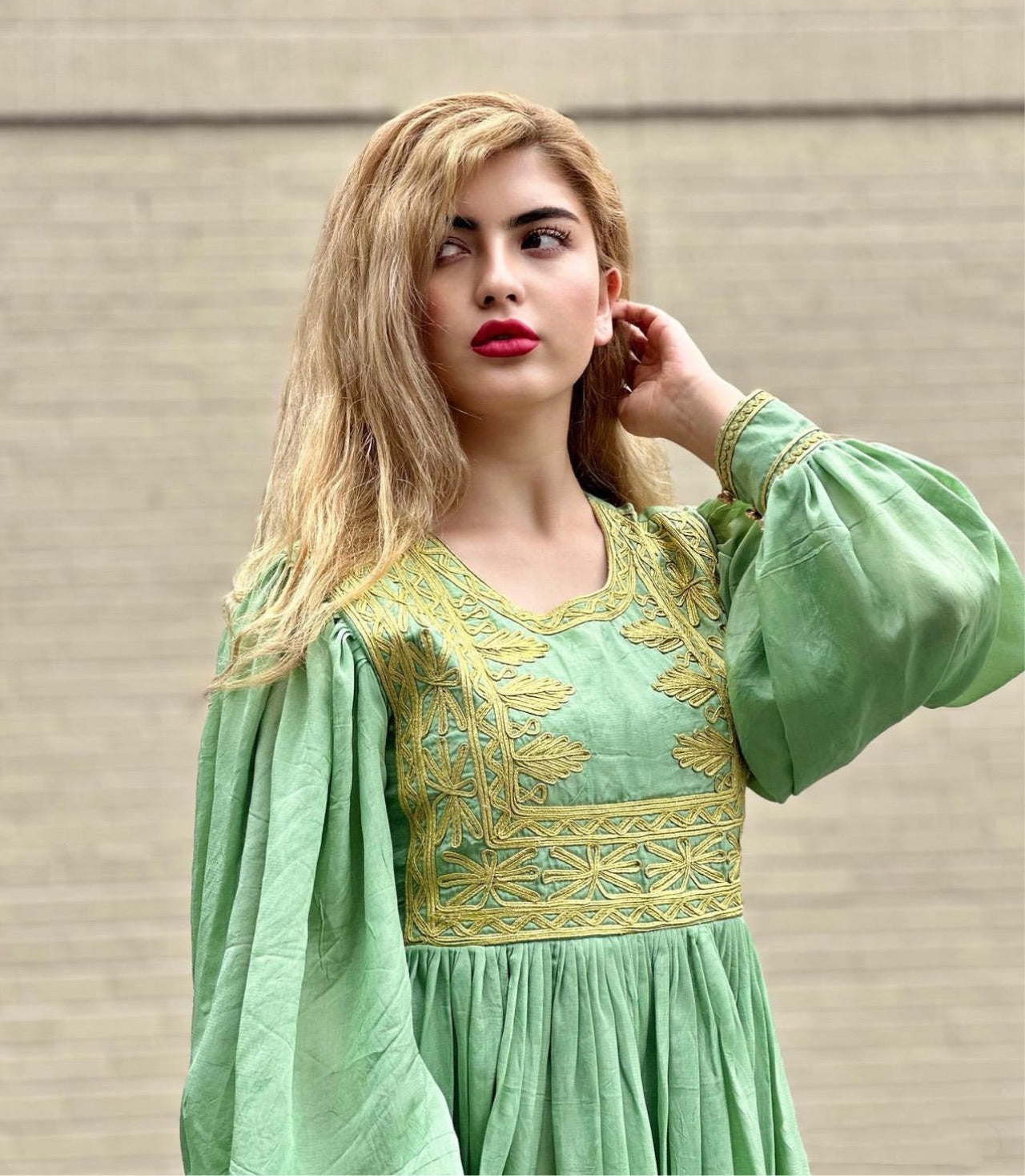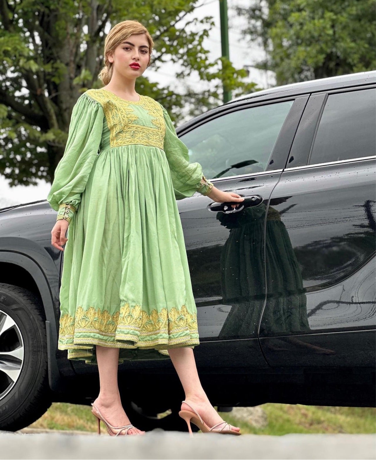 Made from higual quality Layli Meten fabric adorned with intricate Cherma Dozi embroidery, this dress is available in mint green color and comes in small, medium, and large sizes can be worn for various occasions.