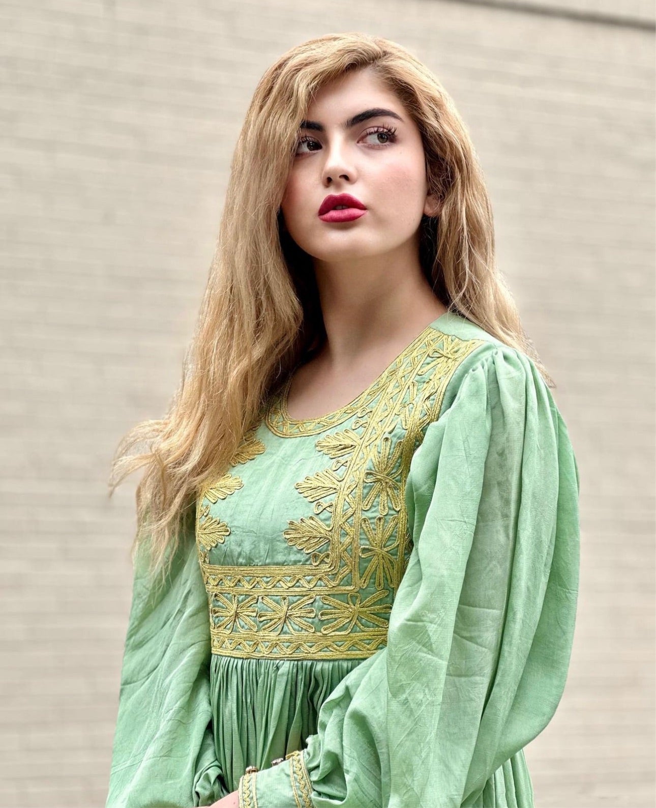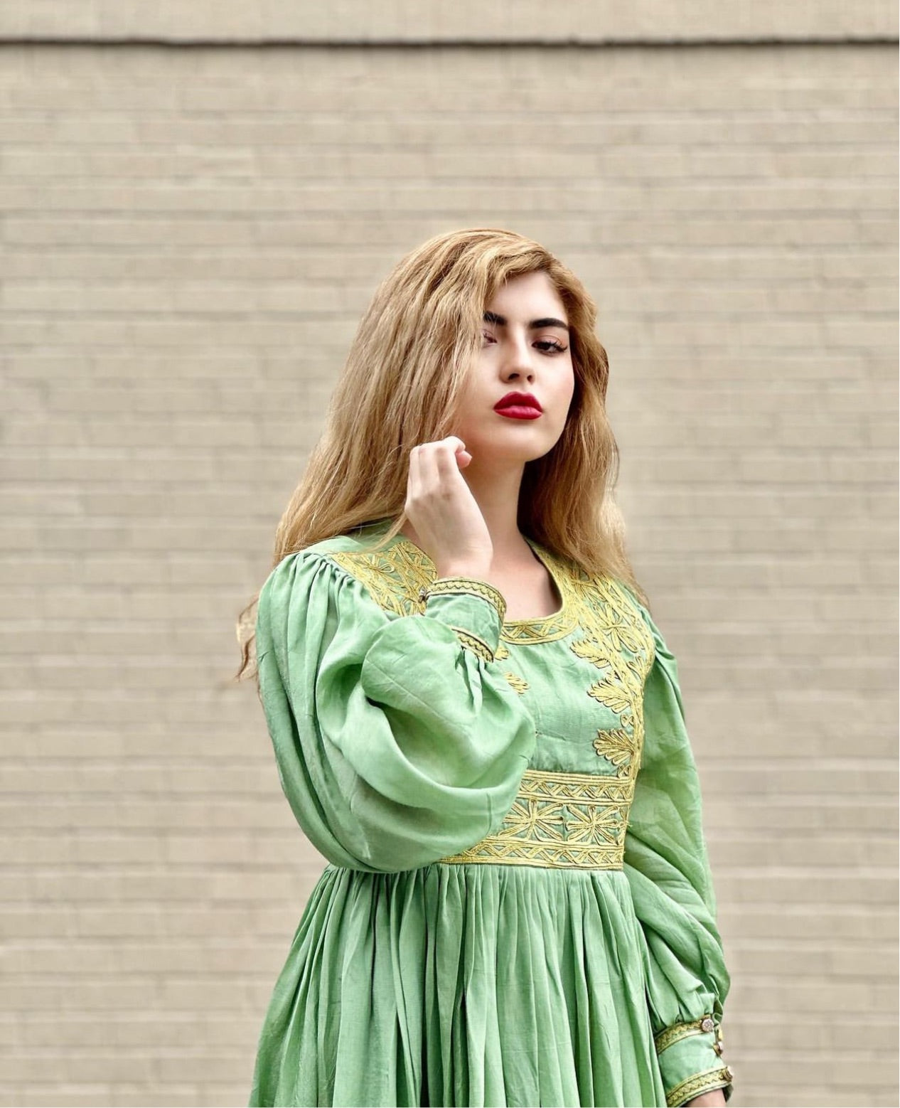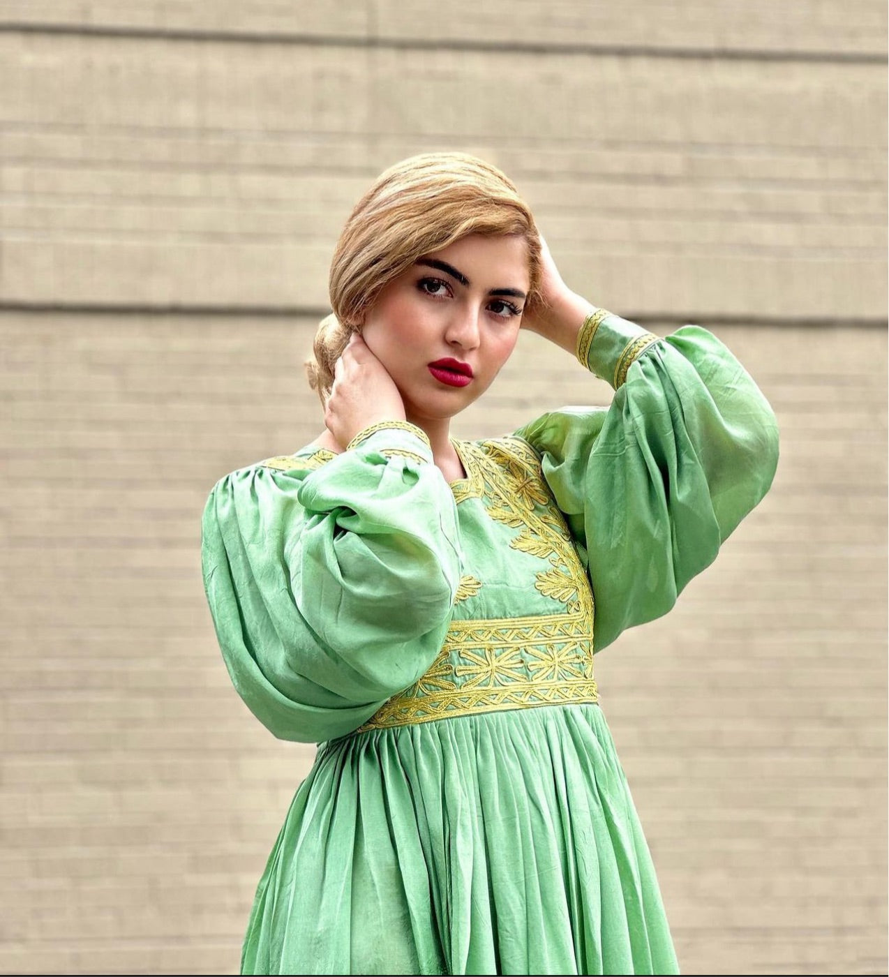 Made from higual quality Layli Meten fabric adorned with intricate Cherma Dozi embroidery, this dress is available in mint green color and comes in small, medium, and large sizes can be worn for various occasions.