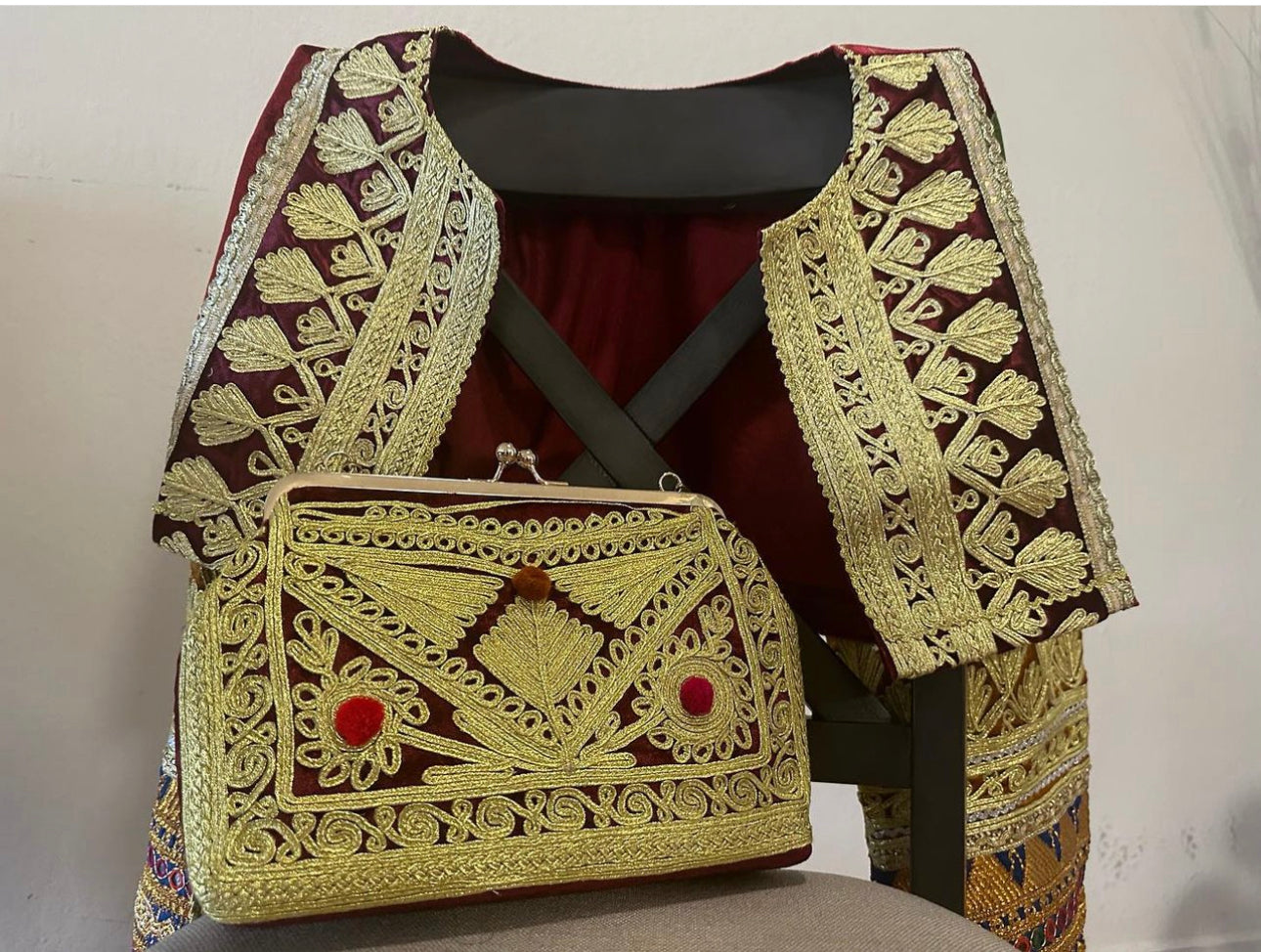 Cherma handbag a modern take on Afghan traditional embroidery. Made from high-quality velvet fabric and adorned with intricate Cherma Dozi embroidery. Available in red, black and blue colors.