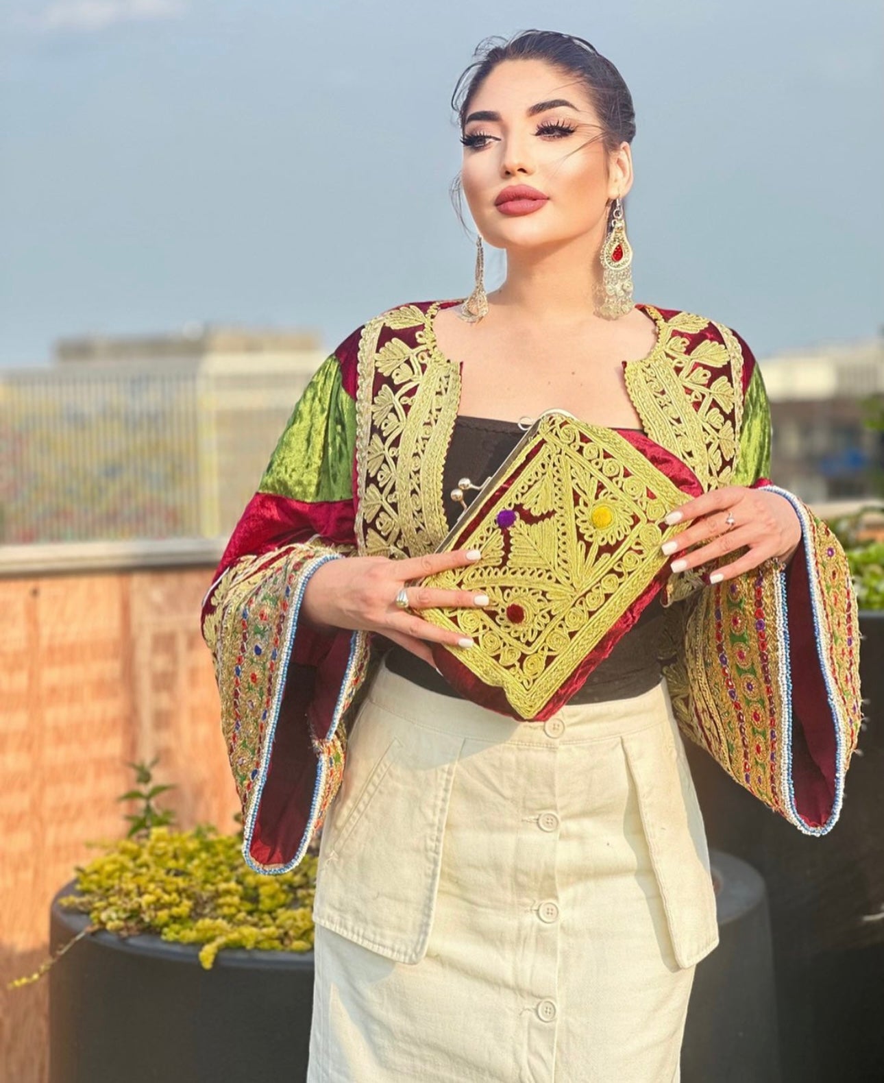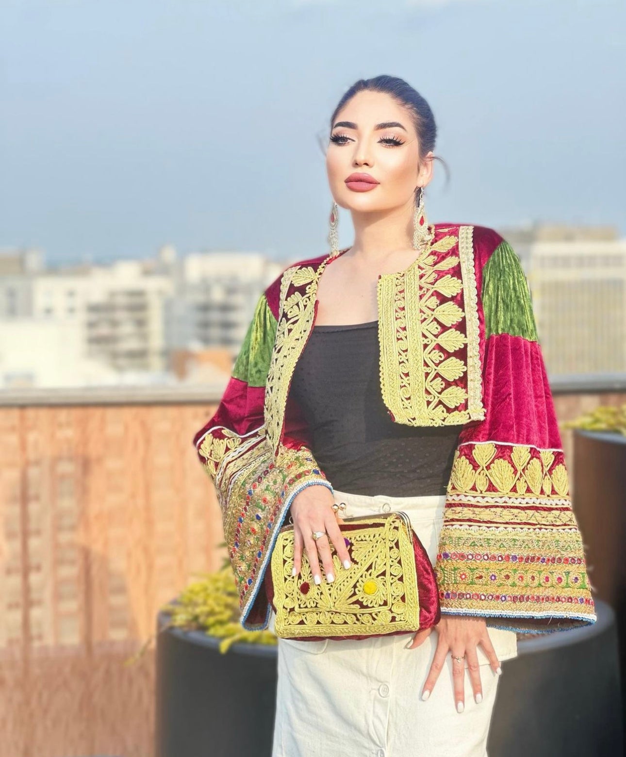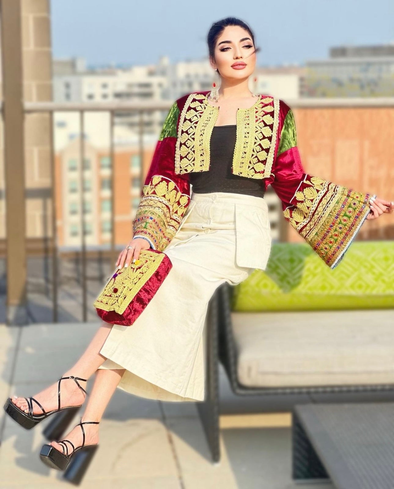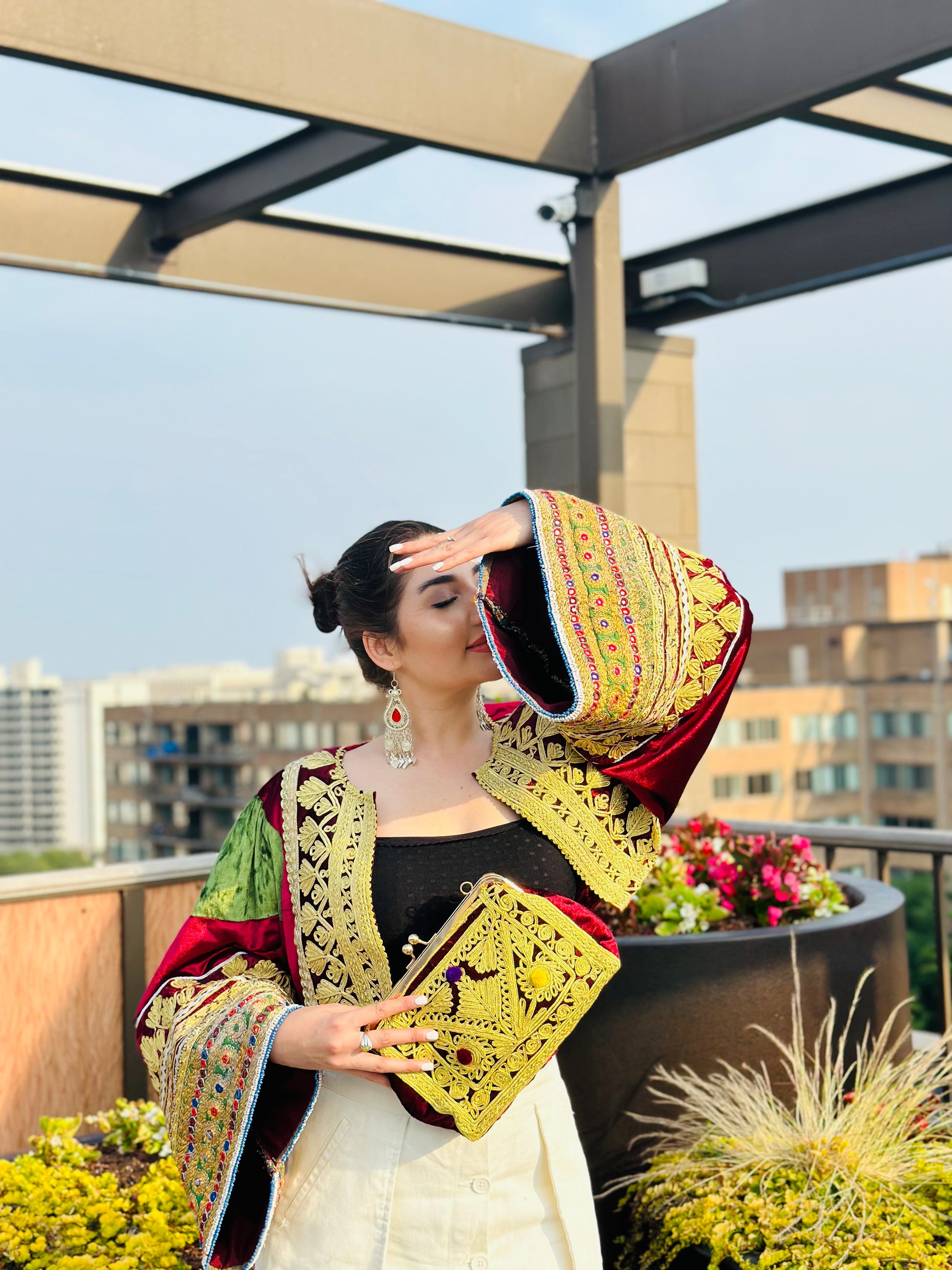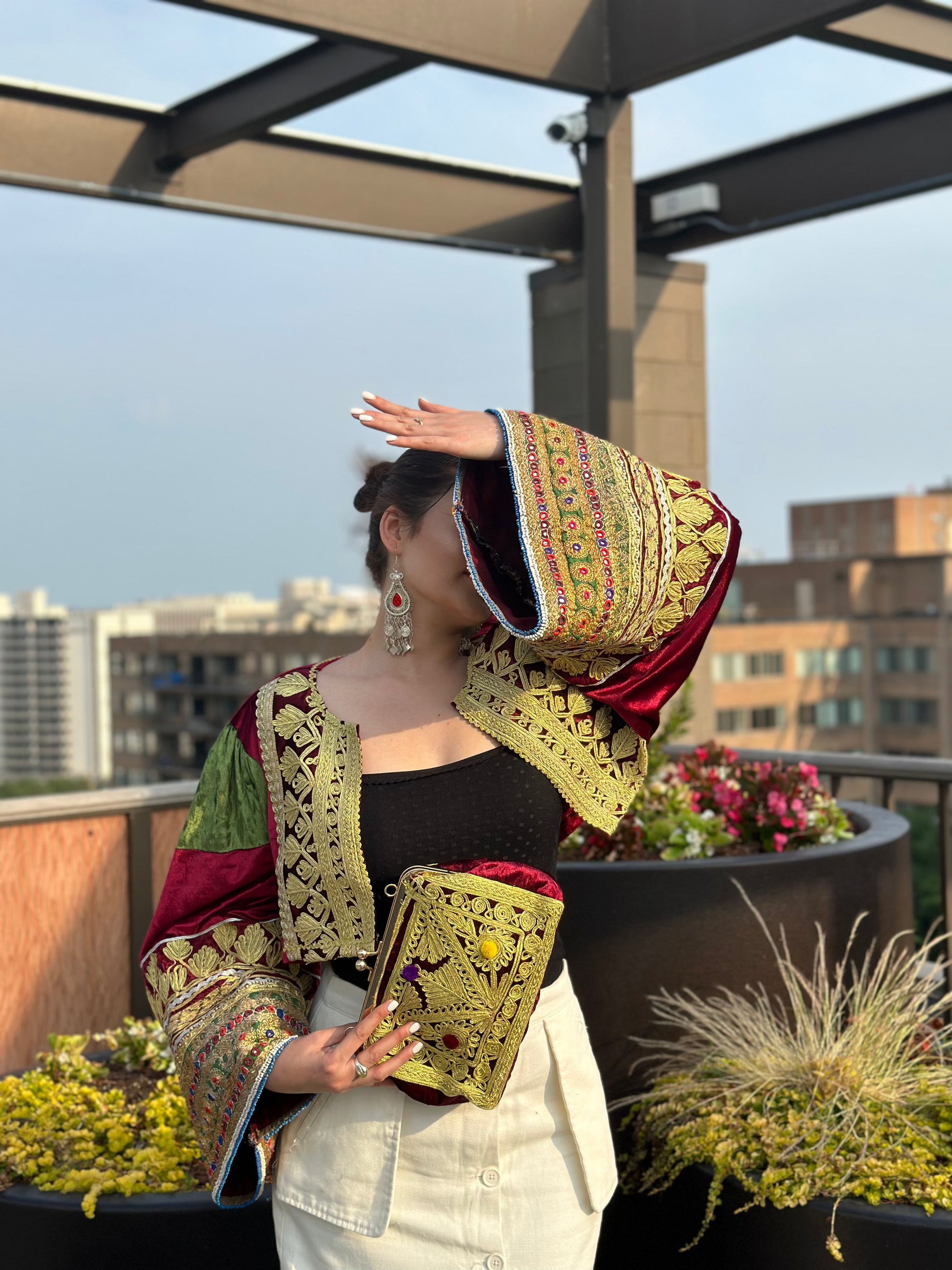 Cherma Dozi crop top a modern take on Afghan traditional embroidery. Made from high-quality velvet fabric and adorned with intricate Cherma Dozi embroidery.