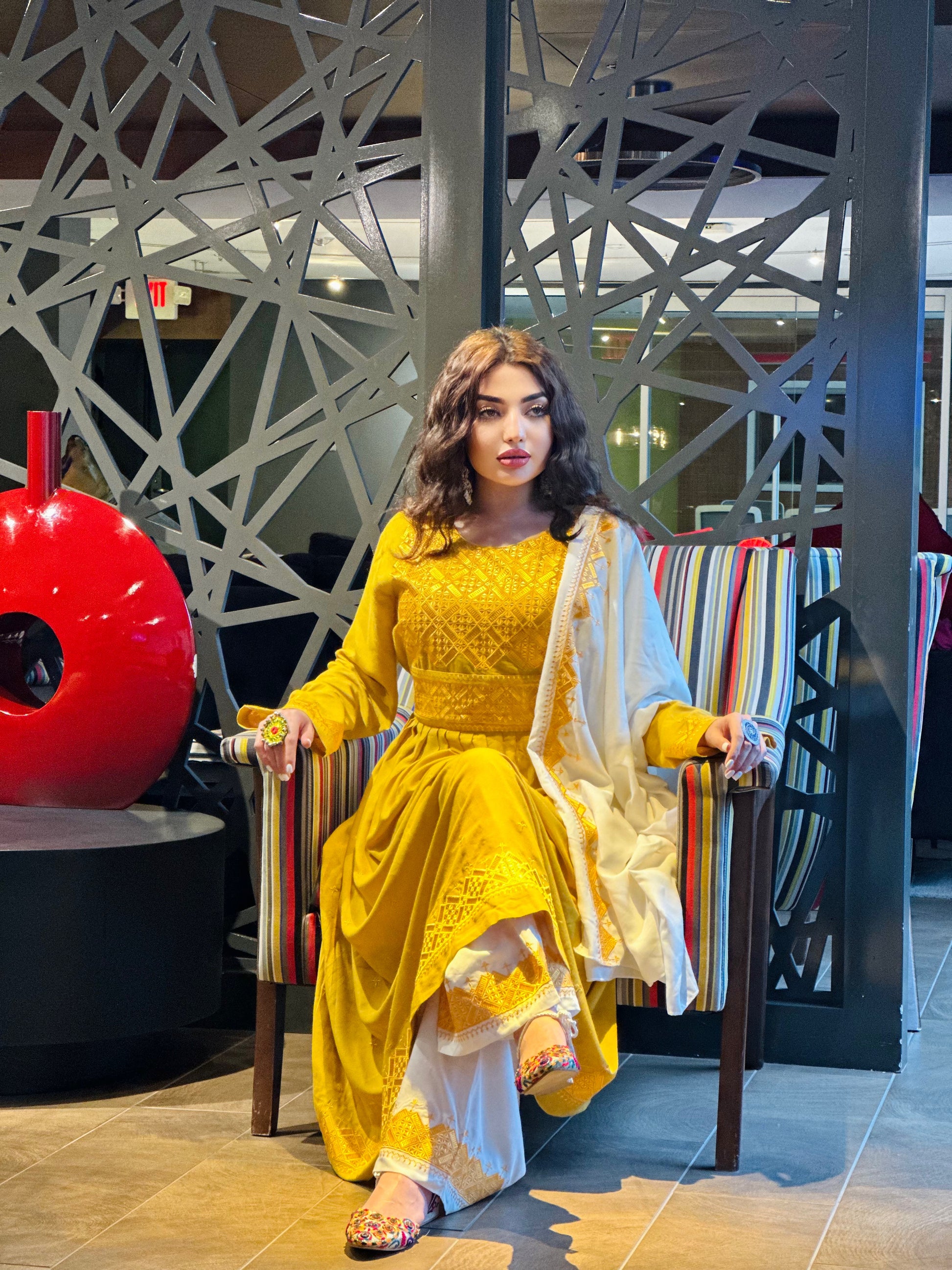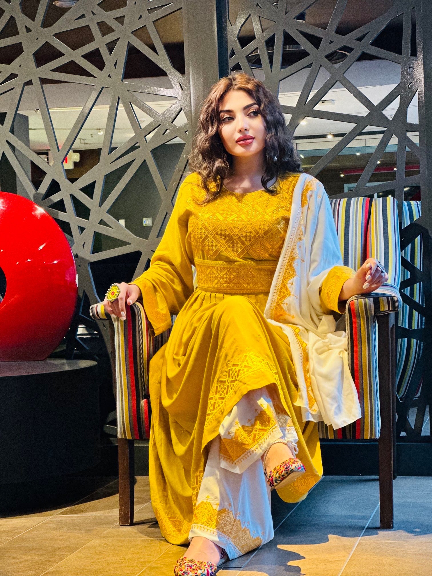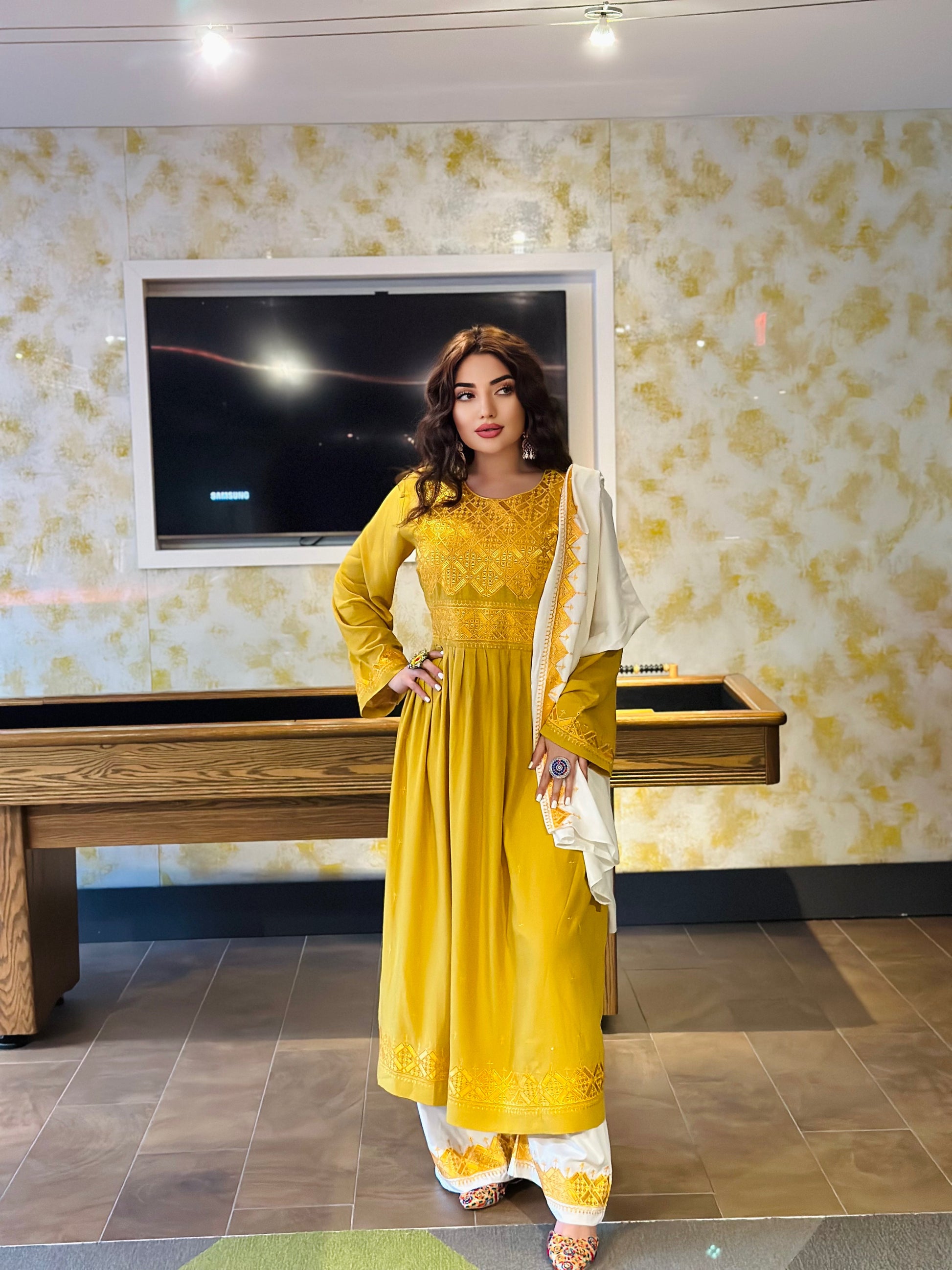 Stunning Hazaragi traditional outfit, includes the dress with matching pant and Shawl. Made with high-quality cotton fabric and adorned with Khamak Dozi. Available in small, medium and large sizes. Perfect for any occasion.