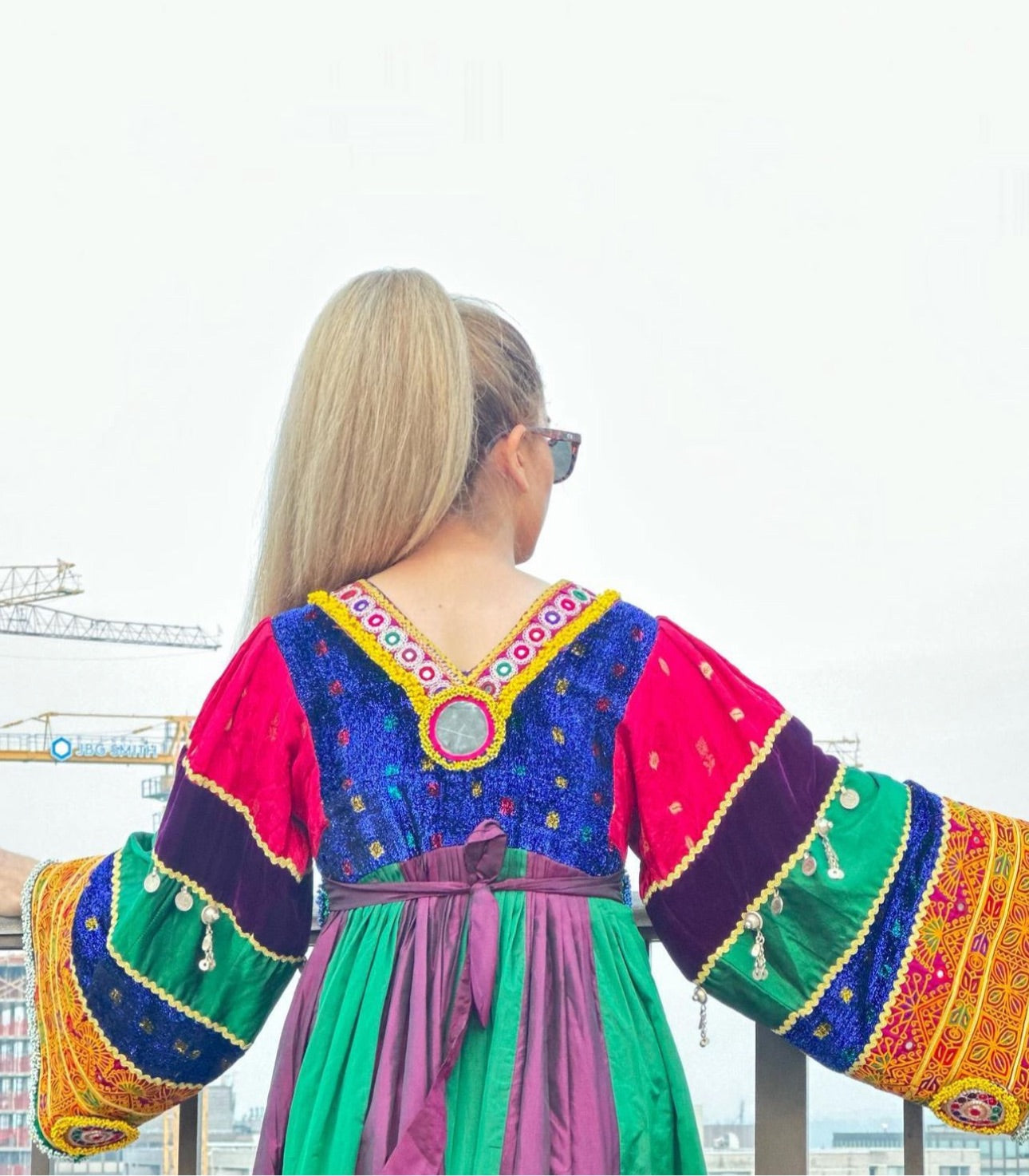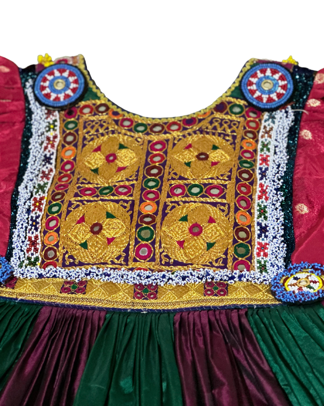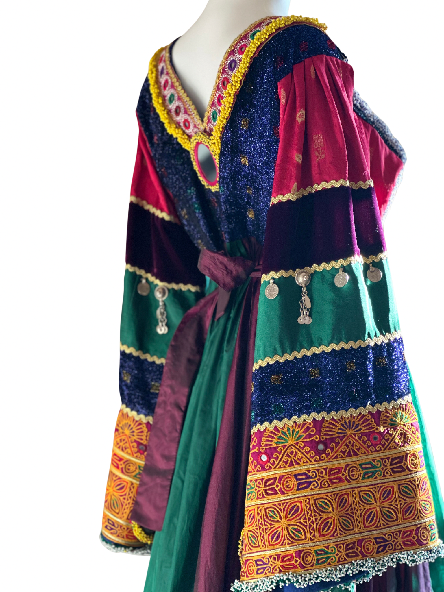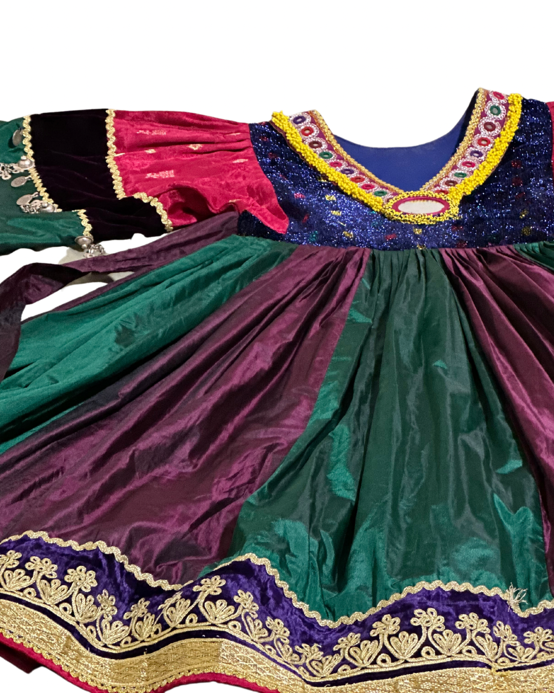 Crafted from antique handwork pieces of traditional Afghan dresses, such as Zartar Dozi, Giraf Dozi, Mora Dozi, Cherma Dozi, Ayna Dozi, Wal Dozi and Cherma Dozi. Made with high-quality silk fabric and adorned with Afghan Coins. Available in small size. Perfect for any occasion.