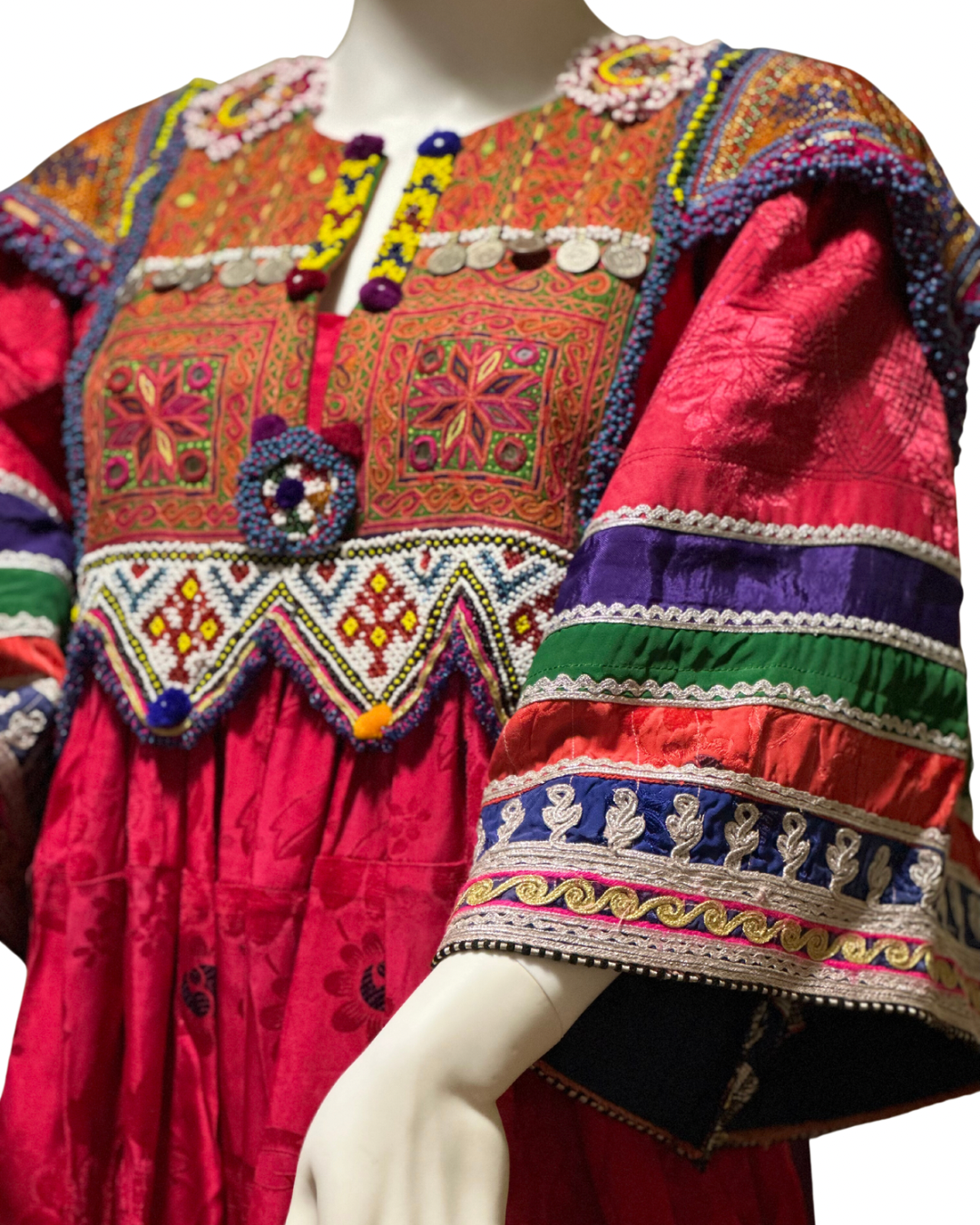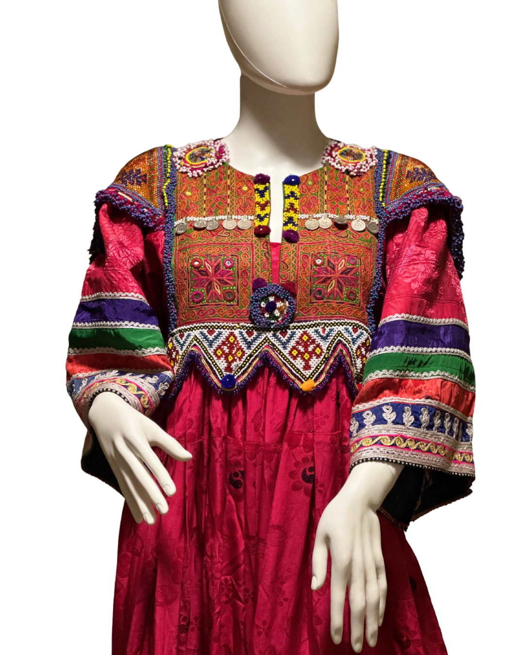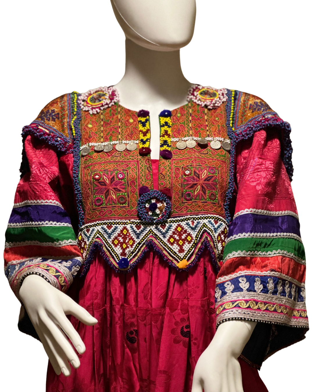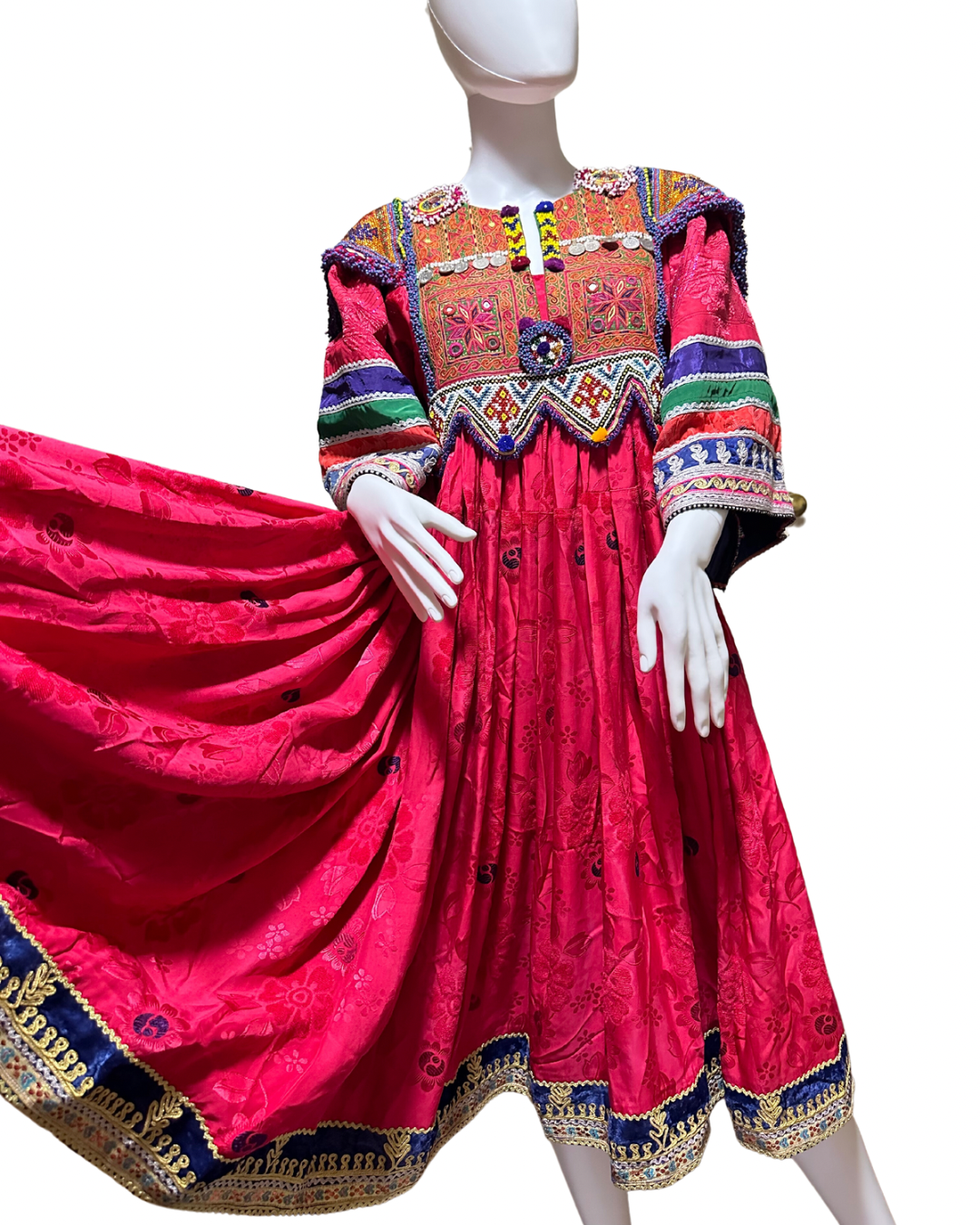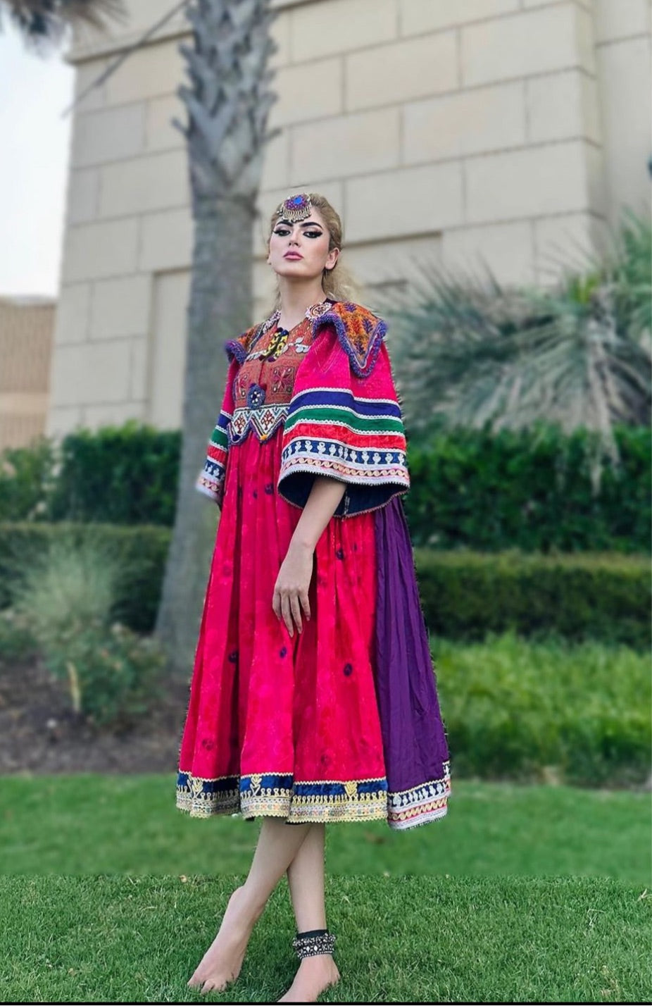 Crafted from high quality antique pieces of amazing handwork picked from traditional Afghan dresses, such as Zartar Dozi, Mora Dozi, Cherma Dozi, and Ayna Dozi. Made with high-quality Luxurious Gul Bakhmal fabric. Available in medium size. Perfect for wedding and special occasions.
