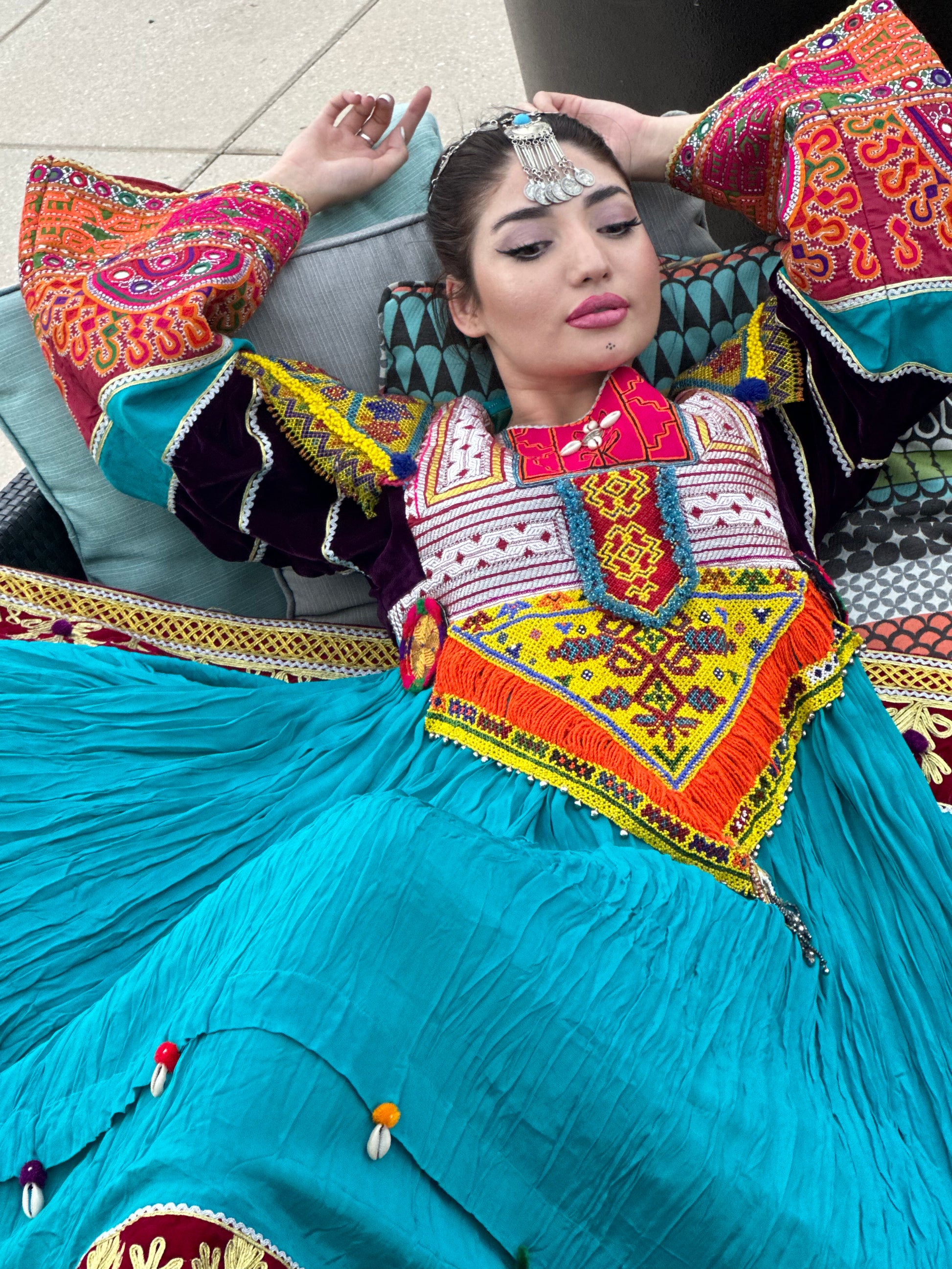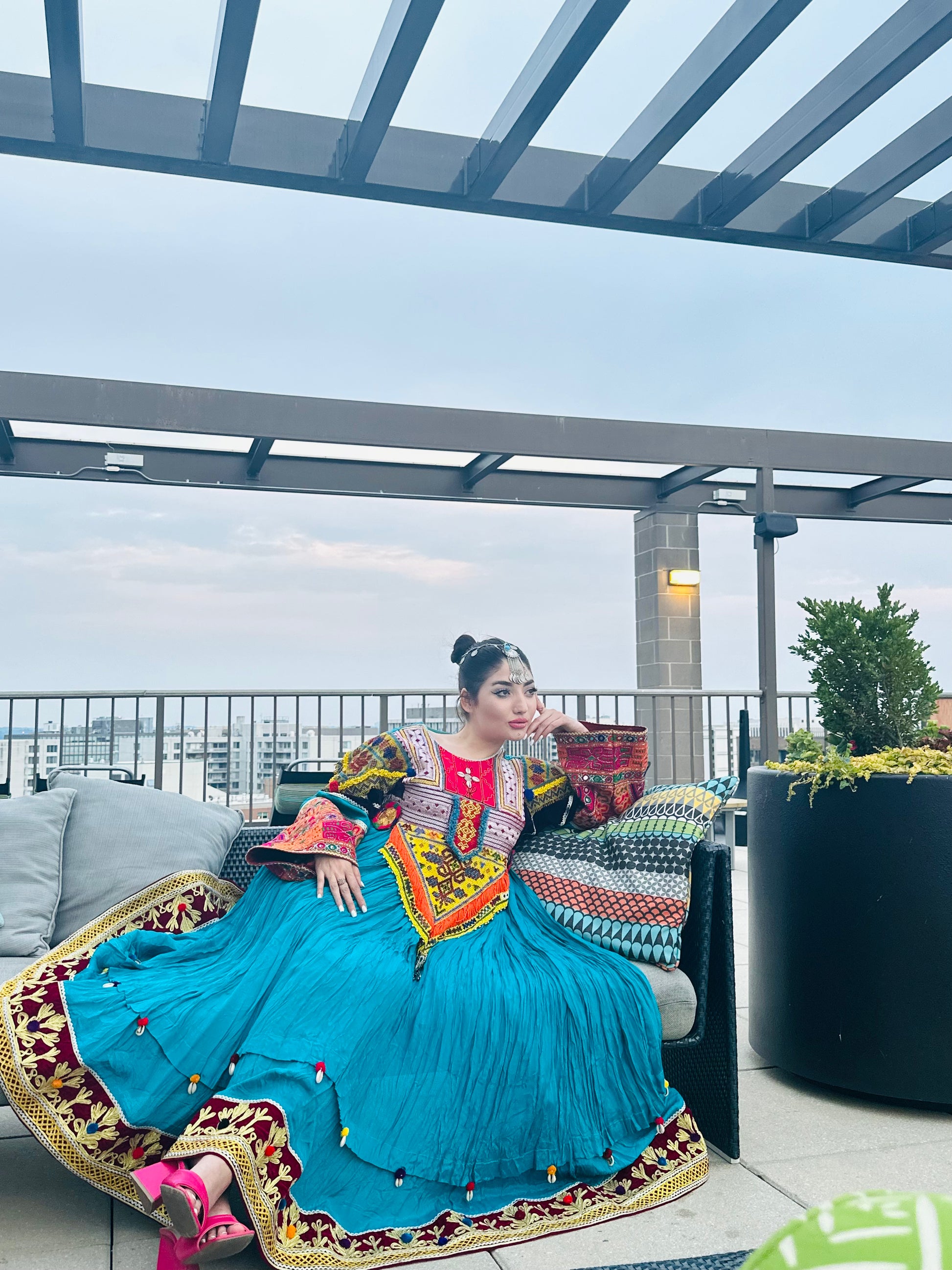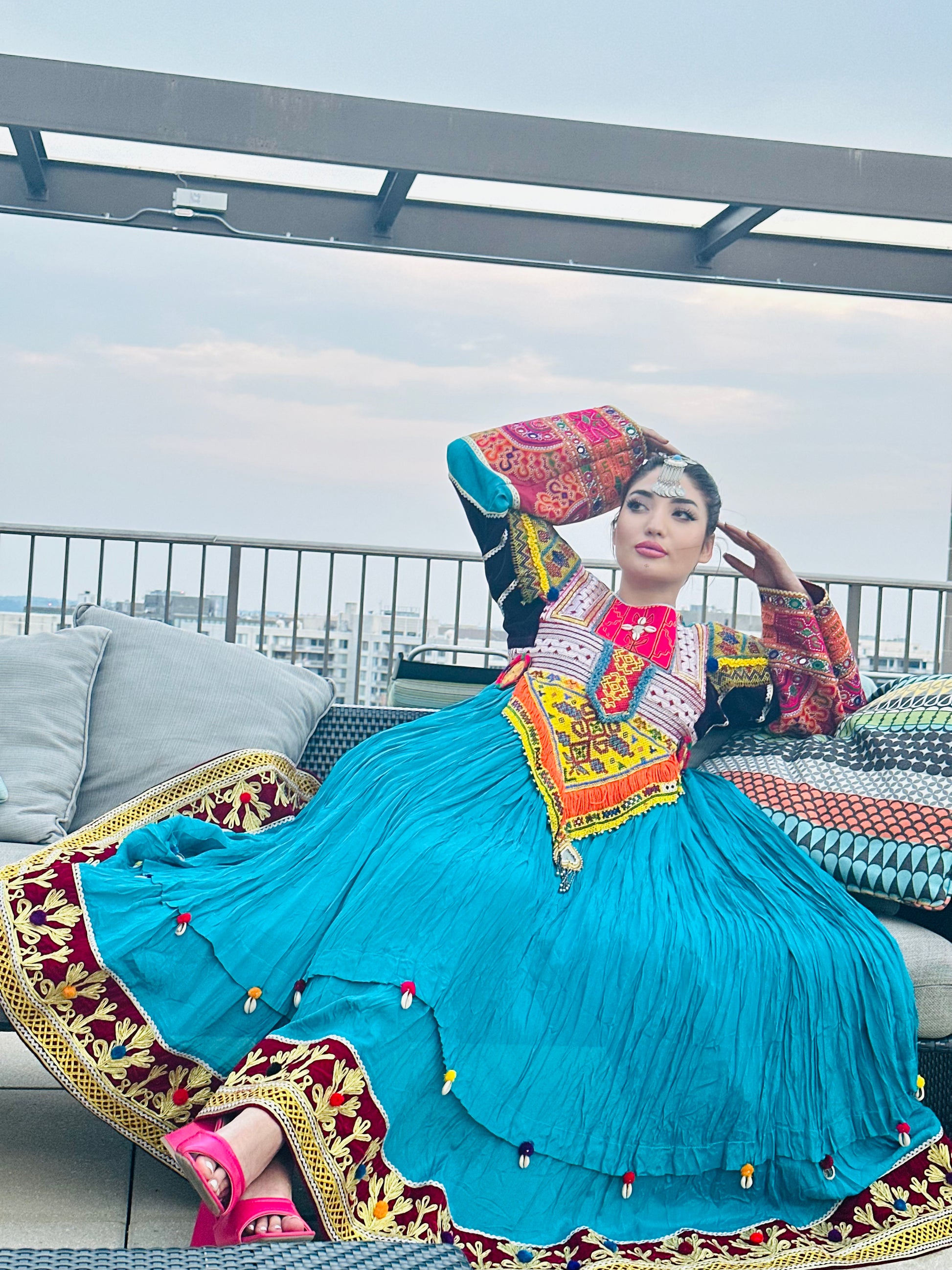 Crafted from high quality antique pieces handpicked from traditional Afghan dresses, such as Zartar Dozi, Giraf Dozi, Mora Dozi, Cherma Dozi, Ayna Dozi, and Wal Dozi. Made with high-quality Layli Meten fabric adorned with sea shells. Available in large size. This dress is a stunning fusion of modern style and ancient craftsmanship that will leave you feeling truly special. Perfect for wedding and special ocasiones.