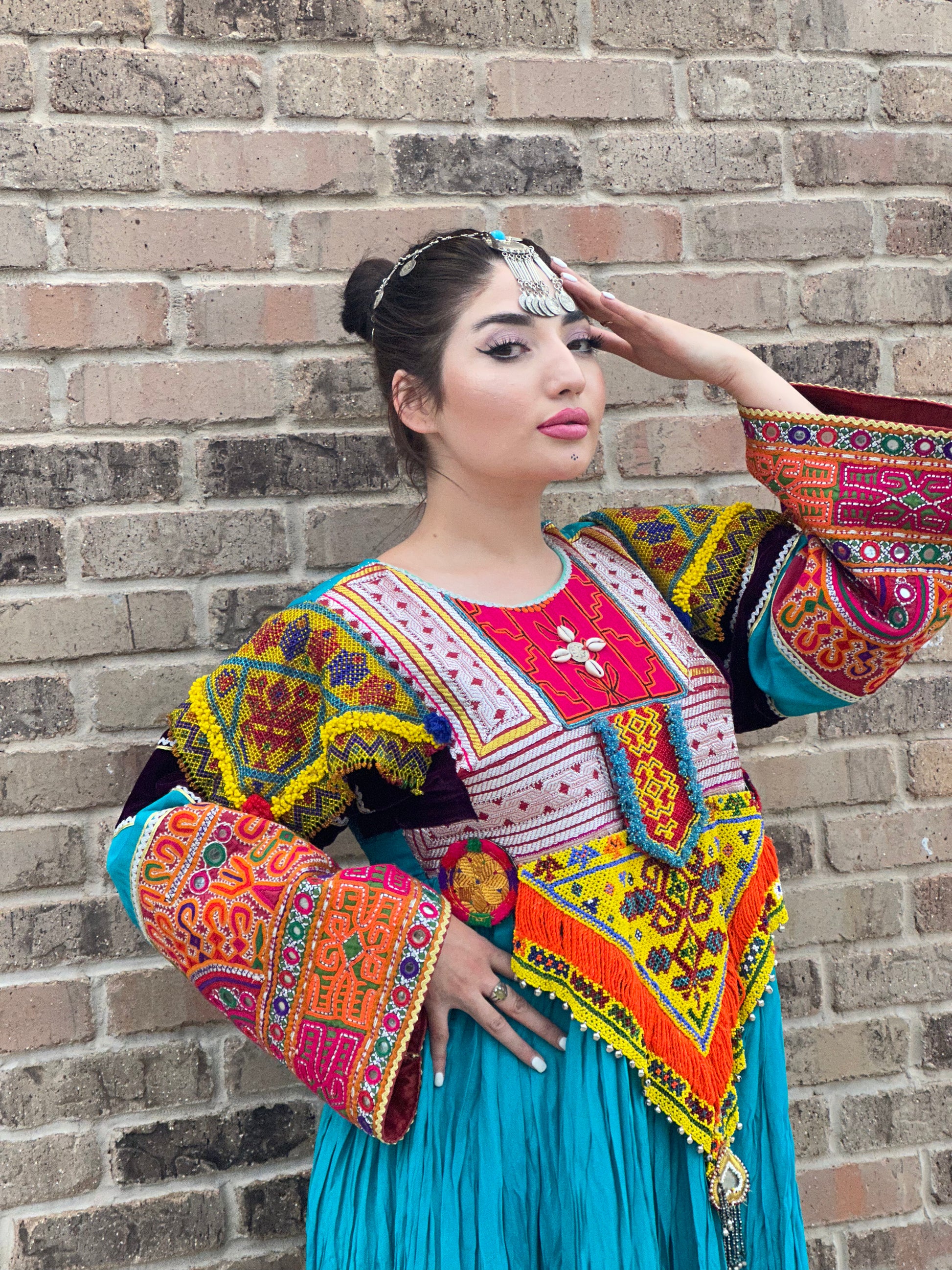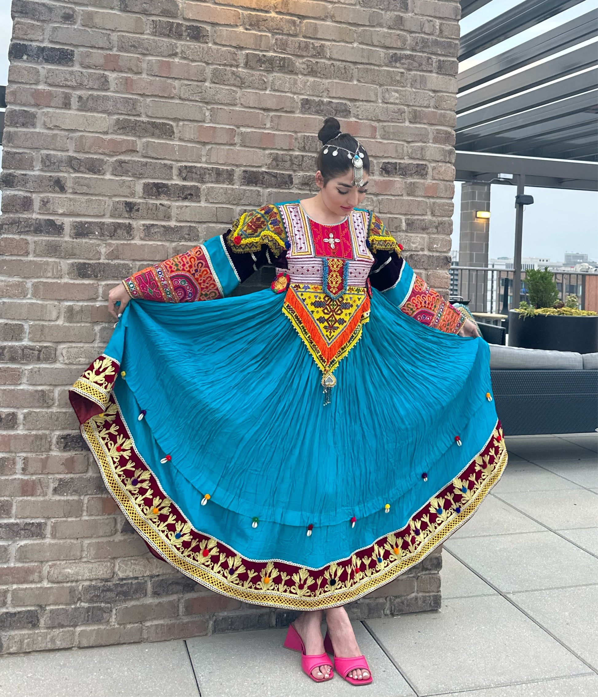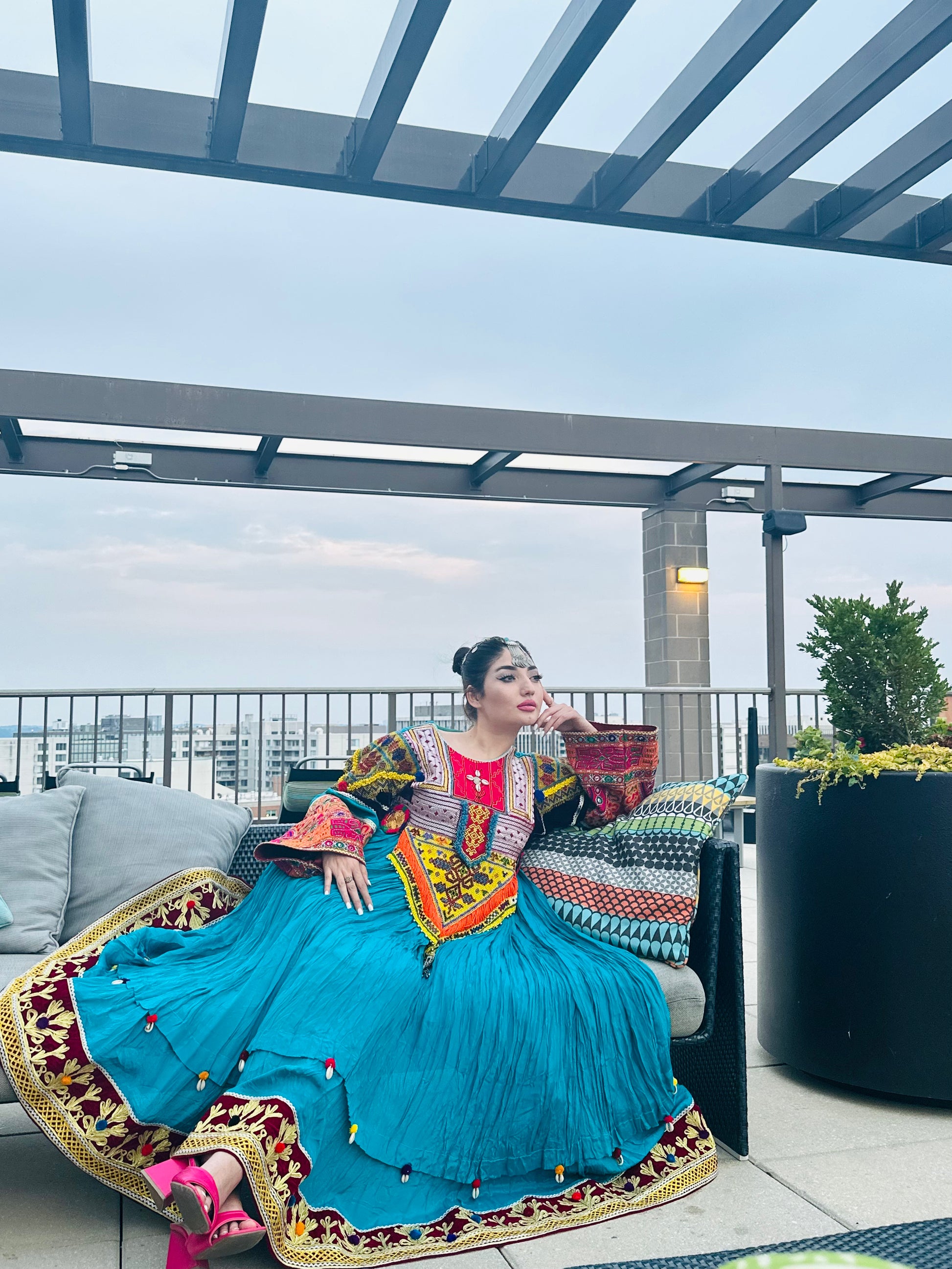 Crafted from high quality antique pieces handpicked from traditional Afghan dresses, such as Zartar Dozi, Giraf Dozi, Mora Dozi, Cherma Dozi, Ayna Dozi, and Wal Dozi. Made with high-quality Layli Meten fabric adorned with sea shells. Available in large size. This dress is a stunning fusion of modern style and ancient craftsmanship that will leave you feeling truly special. Perfect for wedding and special ocasiones.